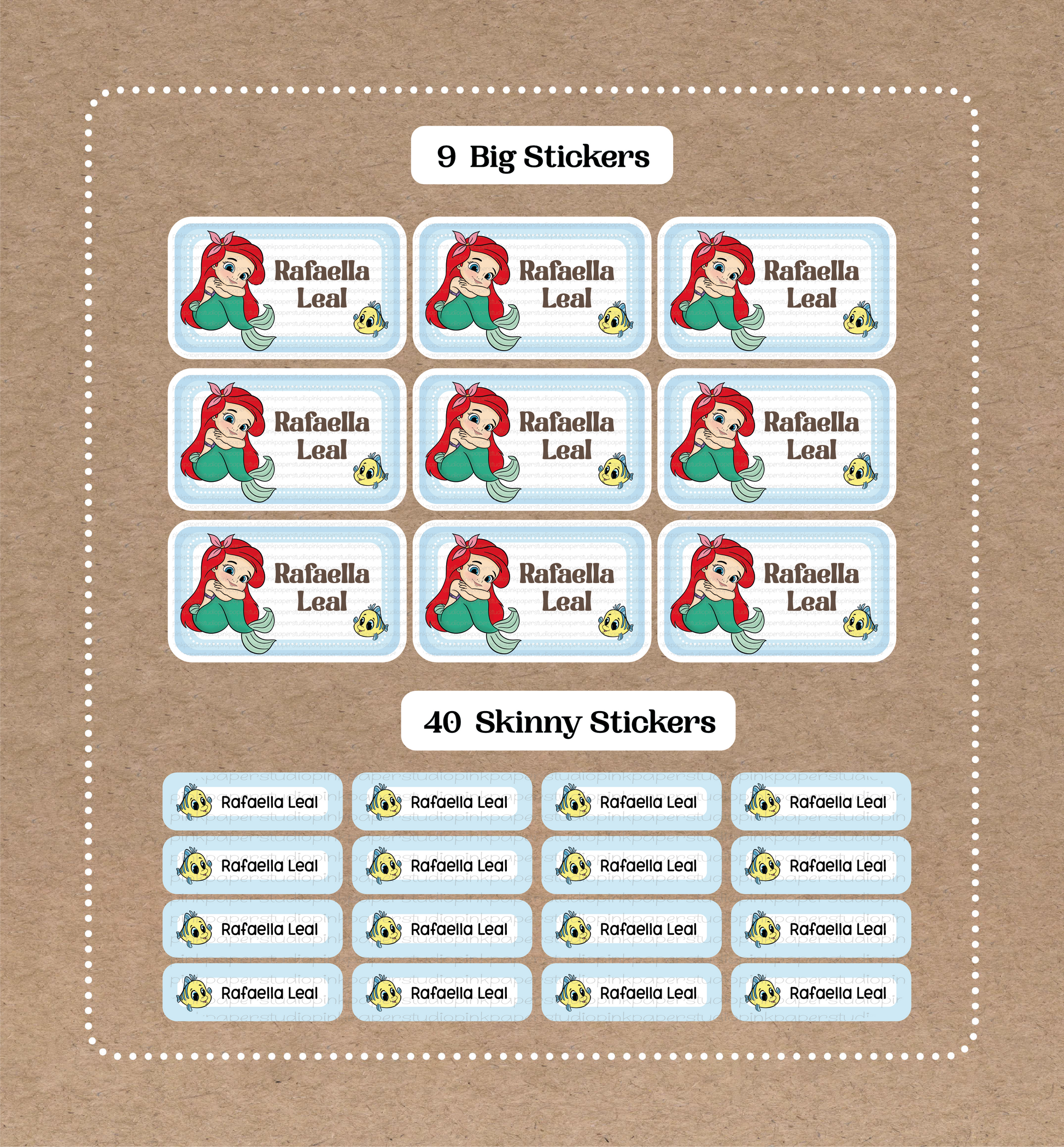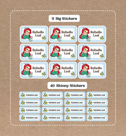 Little Mermaid Set • 9 Big School Name Stickers • 40 Skinny Stickers