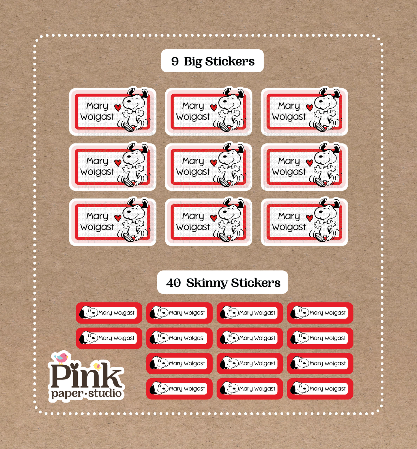 Snoopy Set • 9 Big School Name Stickers • 40 Skinny Stickers