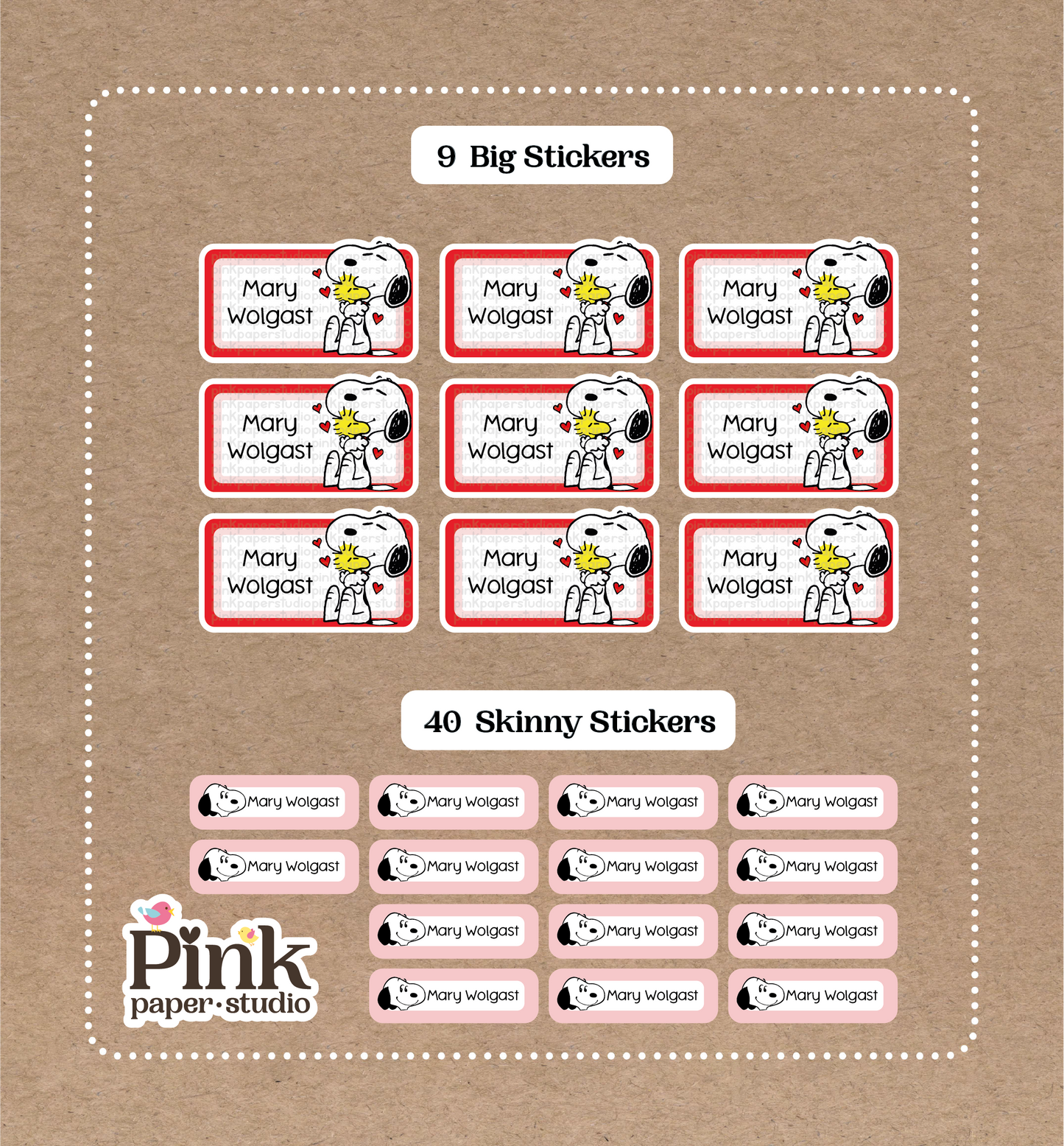 Snoopy Set • 9 Big School Name Stickers • 40 Skinny Stickers