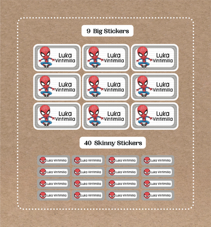 Spiderman • 9 Big School Name Stickers • 40 Skinny Stickers