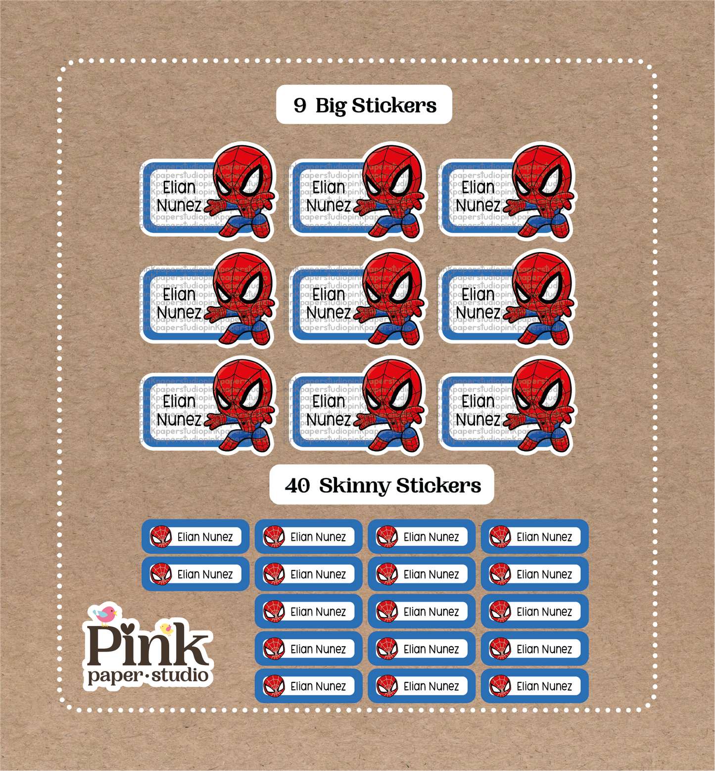 Spiderman • 9 Big School Name Stickers • 40 Skinny Stickers