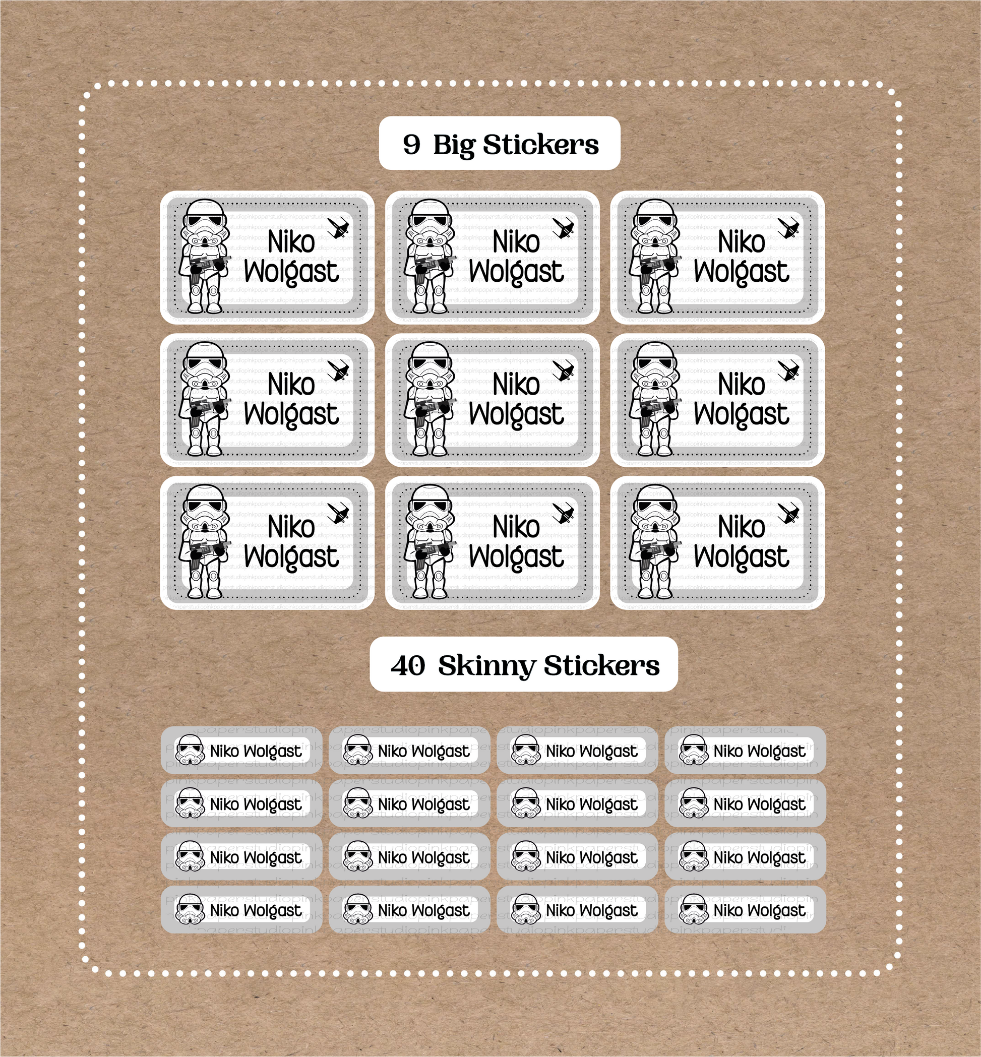 Storm Troopers • Star Wars • 9 Big School Name Stickers • 40 Skinny Stickers